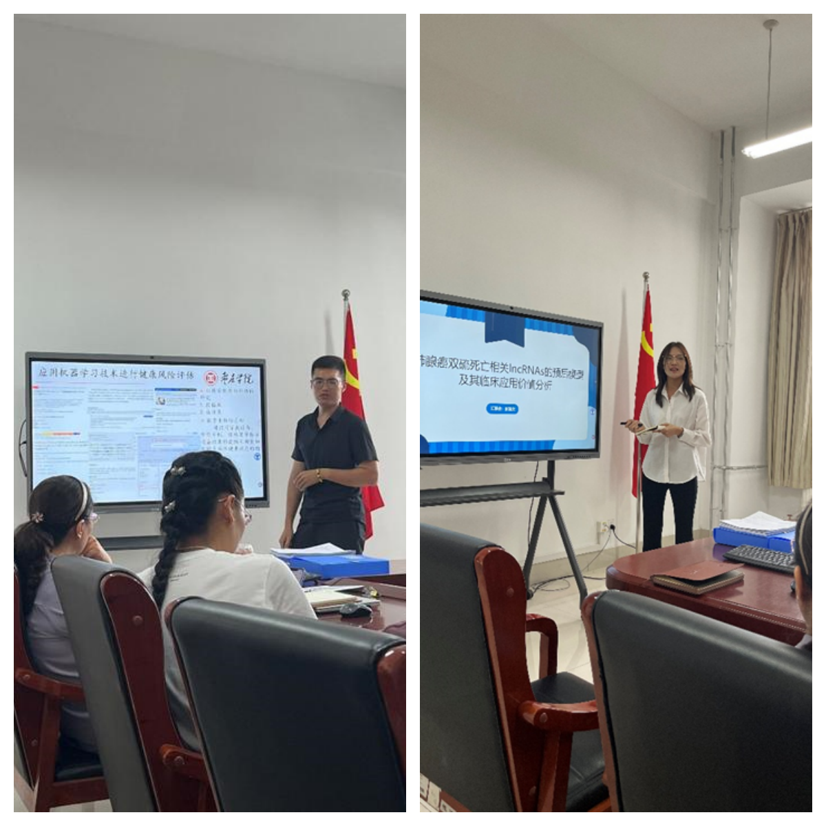 杜劲松结合自己博士期间的科研工作做了题为《生物医用材料的制备与慢性病风险评估系统的构建仿真研究》的学术报告。张瀚文结合自己硕士期间的科研工作做了《肺腺癌双硫死亡相关lncRNAs的预后模型及其临床应用价值分析》的学术报告。