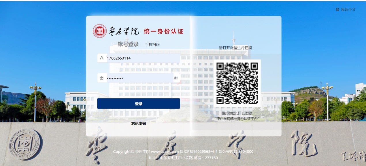 使用统一身份认证账号和密码登录或手机微信扫码登录。