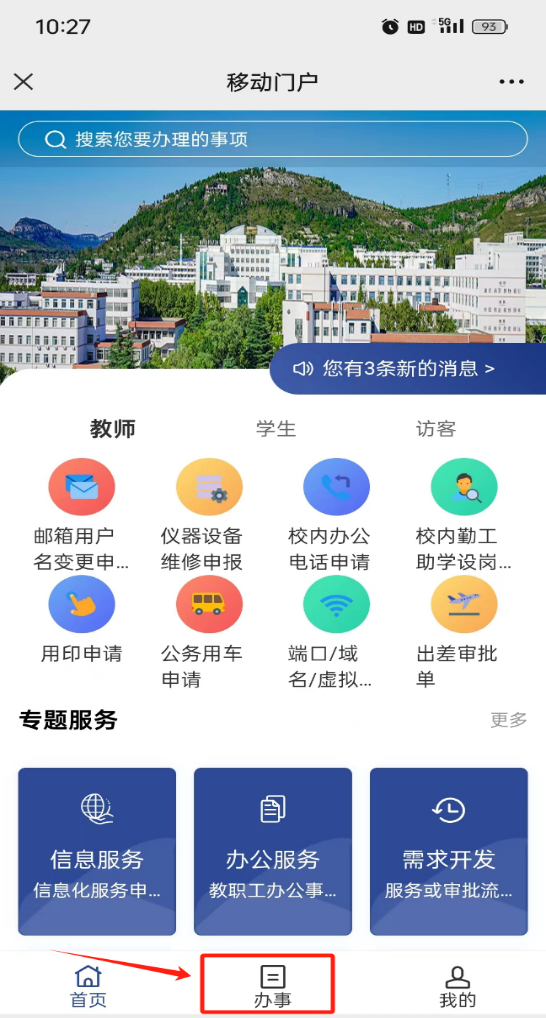 办事大厅提供事务地图,展示已上线的关于师生、游客的所有服务,汇总所有的事务及简介,点击可直接进入事务办理流程。每个服务点开后会展示办事指南、流程图、在线办理、收藏,用户可直接点击对应按钮,进行业务查询办理。