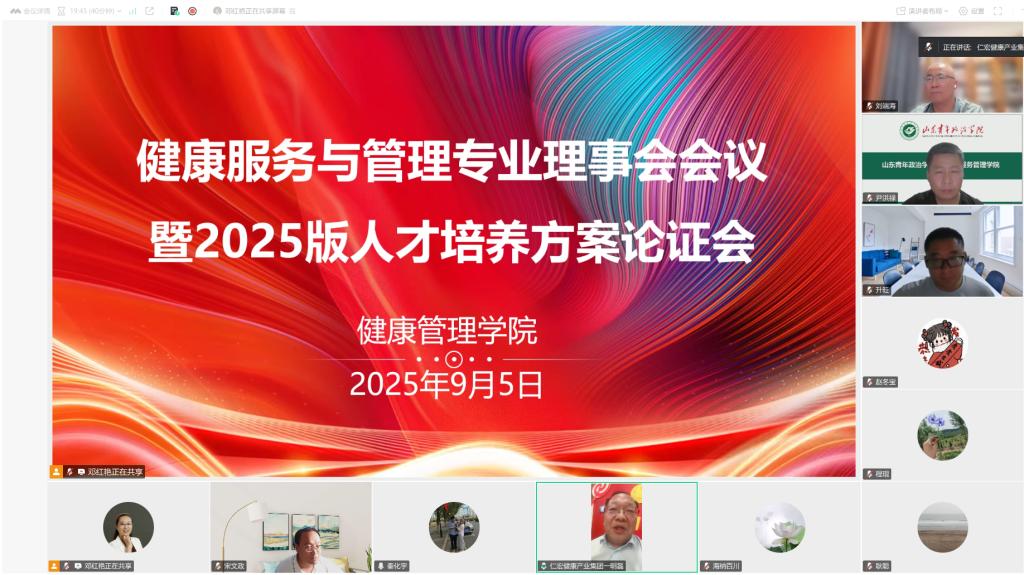 为进一步优化健康服务与管理专业人才培养体系,提升人才培养质量,2025年9月5日,太阳成集团tyc9728通过线上会议召开了“健康服务与管理专业理事会会议暨2025版人才培养方案论证会”。本次会议邀请了山东女子公司教务处处长、健康养老公司经理闫小红、山东青年政治公司现代服务管理公司副经理尹洪禄、山东医学高等专科公司基础二部(公共卫生系)党务、系部负责人杨亮、枣庄科技职业公司医药卫生公司经理刘端海、仁宏健康产业集团有限公司董事长明磊、太阳成集团tyc9728体育公司副经理周生旺6位专家学者,围绕专业定位、课程体系、实践教学及职业发展路径等核心内容展开深入研讨。康养教研室全体教师参加会议,会议由副经理周海玲教授主持。