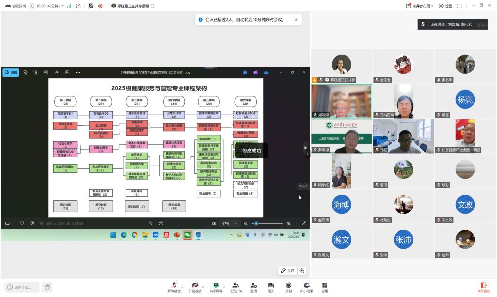 与会专家就培养方案的培养目标、毕业要求、课程设置等内容展开深入讨论。与会专家一致认为,该方案目标明确、结构合理,符合当前健康服务业发展趋势。同时,专家们也提出了建设性意见,如OBE理念融入全流程人才培养,进一步加强数据分析与健康管理信息技术的课程比重,拓展与基层医疗卫生机构合作的实践平台,强化员工职业素养与沟通能力的系统训练等。