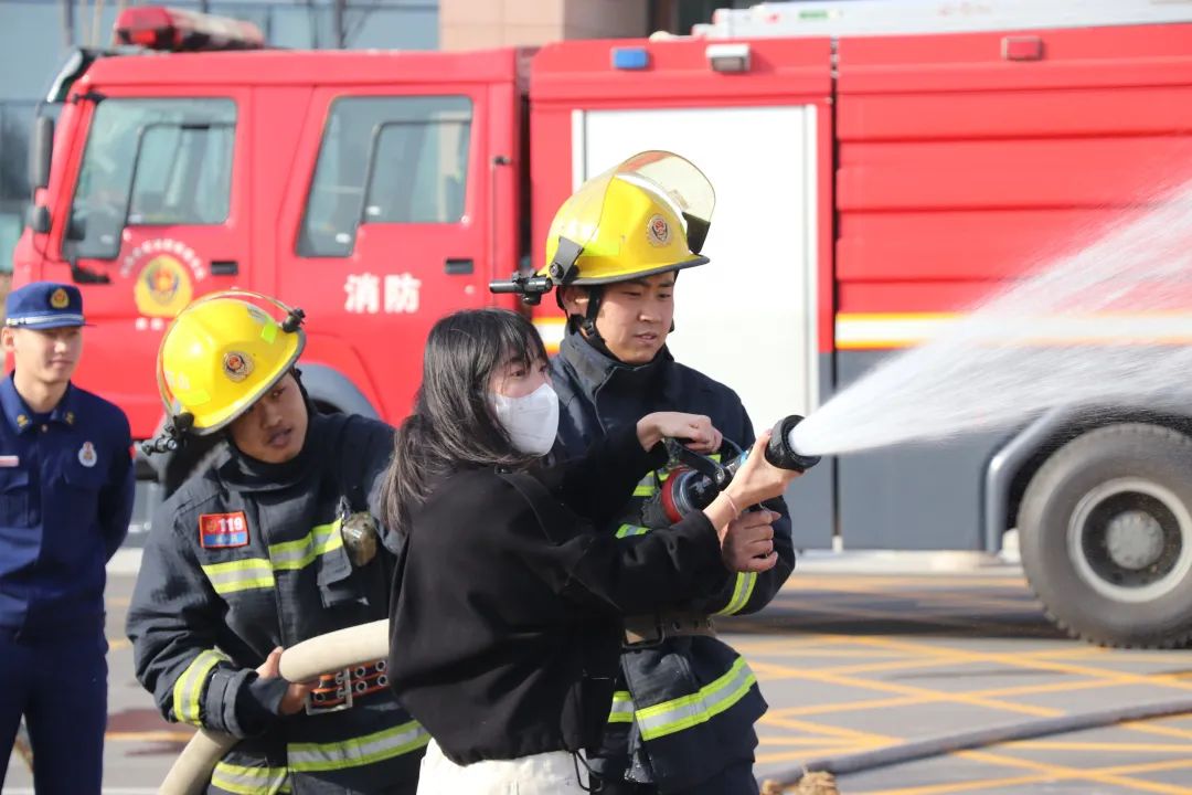 讲座结束后,在相关人员的组织下,同学们进行消防安全演练,快速撤离到空旷的地方。随后,消防员向同学们展示了消防车上的登高平台,并在保证安全的前提下,由消防员带领两位同学亲身体验。最后,工作人员在空旷地带升起火源,并向同学们演示如何使用灭火器,使同学们亲手体验灭火的过程。