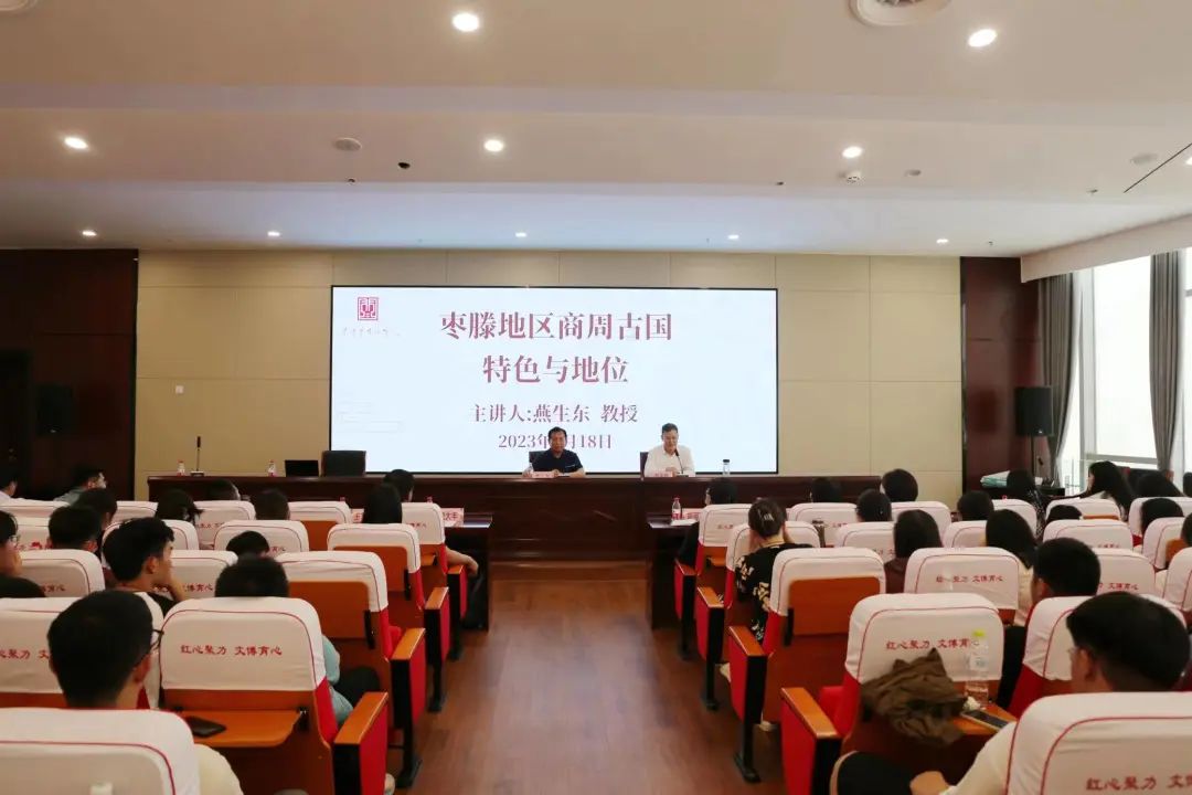 燕教授从枣庄的地理位置讲起,介绍了枣滕地区商周古国众多的原因:枣庄北扼齐鲁,南控江淮,位置显要,曾是东夷集团重要活动区域。考古发掘与历史文献研究表明,枣滕地区周代的10多个邦国,既有华夏邦国,也有东夷邦国,还有南方的祝融集团,是东方地区发现商周时期邦国数量最多、姓氏及族属最为复杂的区域之一。随后,燕教授按照历史顺序逐一介绍了主要邦国的发现过程、城邦形态特征和变化过程的典型区域,带领师生们领略了灿烂的枣滕邦国文化。