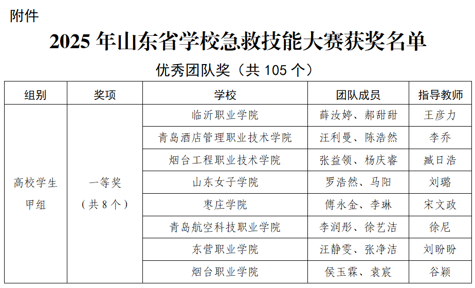 近日,山东省教育厅公示了第三届公司急救知识与技能大赛获奖名单。公司2023级傅永金与2024级李琳两位同学,在宋文政、程琨老师的指导下,凭借扎实的理论基础、熟练的操作技能和出色的应急处理能力,荣获高校员工甲组(非医学大类专业)团体一等奖,宋文政老师同时获评“高校优秀指导教师奖”。