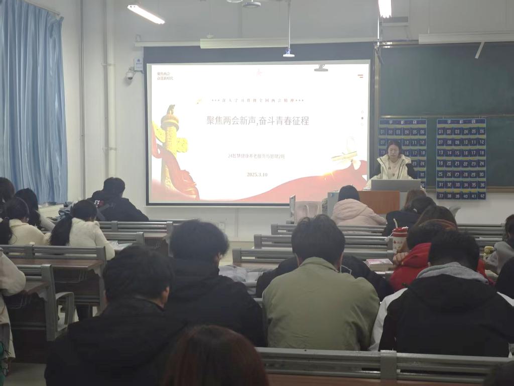 活动伊始,主讲人结合PPT、视频,通过专题学习、交流研讨、实践倡议等形式,带领同学们详细解读了2025年两会热点,围绕政府工作报告中“高质量发展”、“科技创新”、“乡村振兴”、“民生保障”等青年热点话题进行讲解,让同学们对两会有了全面且直观的认识。