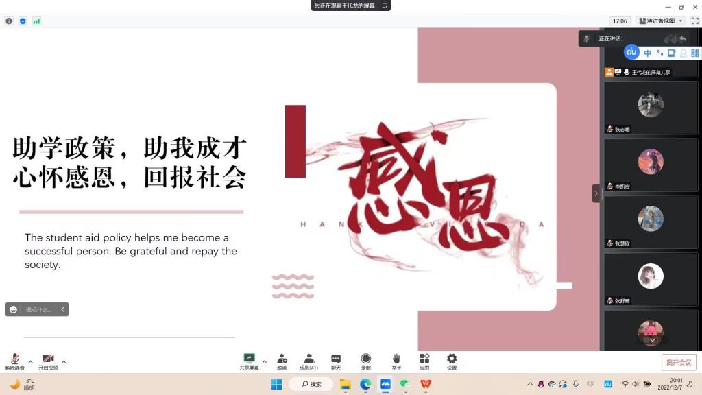 为全面落实“立德树人”根本任务,充分发挥员工资助工作的育人和导向功能,培养员工懂得感恩的良好品行,12月7日,公司组织各班开展感恩教育线上主题班会。