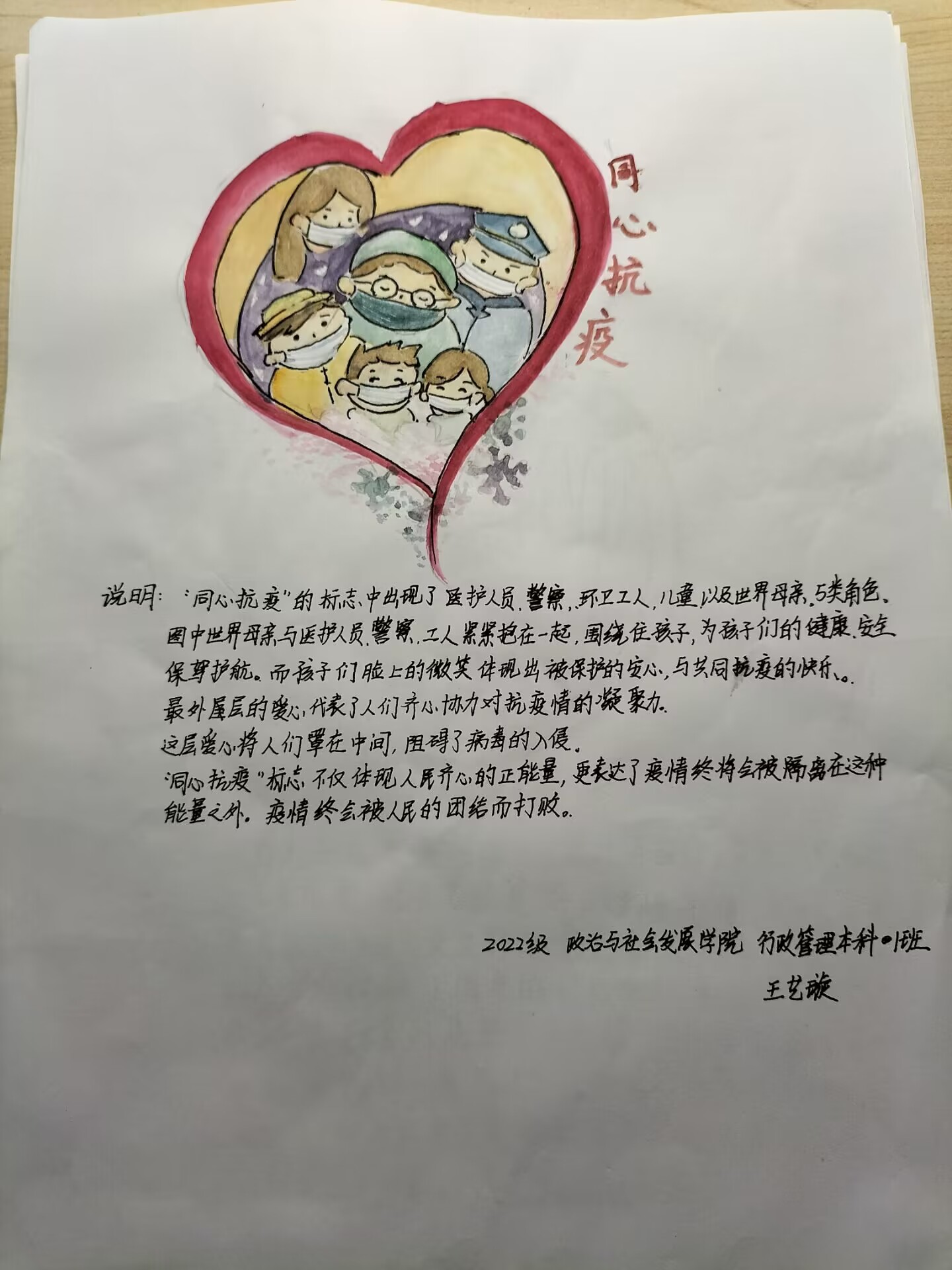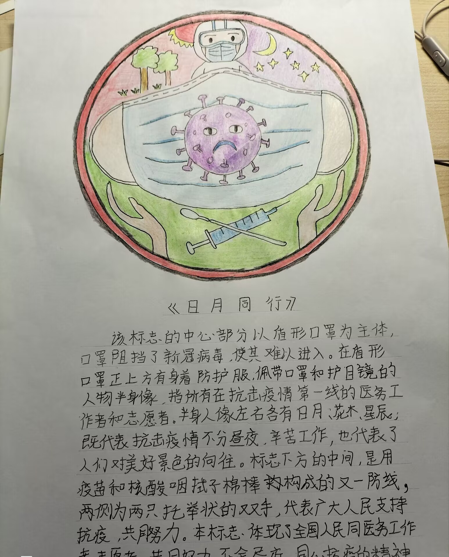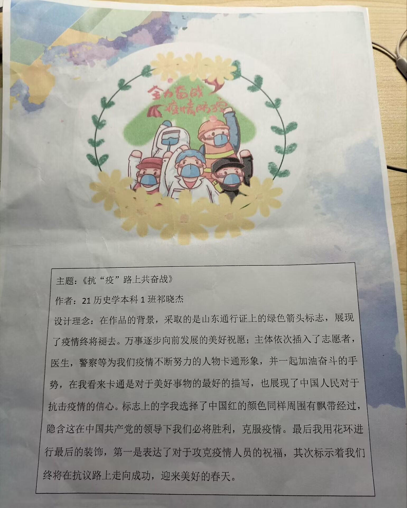 此次活动以疫情防控为中心,让同学们进行自由创作。同学们设计的作品,内容紧扣疫情防控这一主题,积极向上,具有一定的教育意义;在形式上,通过对标志进行配色,并加以配文解释,生动形象地表达出所设计的作品寓意,传达出各位同学对疫情防控认识的深化以及对早日战胜疫情的期待与信心。比赛共设有六个奖项,其中一等奖一名,二等奖两名,三等奖三名。其中作品《抗“疫”路上共奋战》结合实际的山东通信行程卡的设计,获得评委一致好评,斩获一等奖。