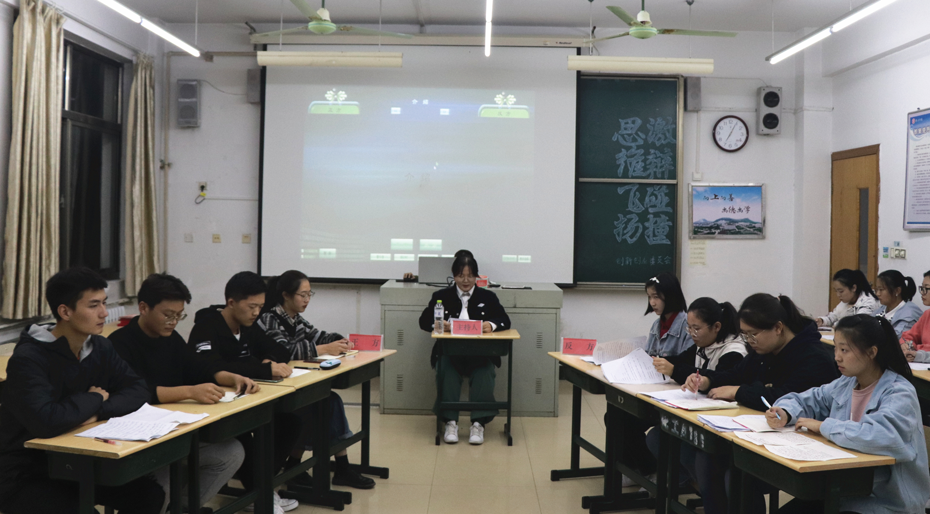 活动伊始,主持人介绍了比赛规则和比赛流程,正反方一辩分别做限时为两分三十秒的陈词。在开篇立论环节,正反方一辩都进行了简明严谨的阐述。紧接着,双方二辩三辩进行一对一攻辩。面对对方辩手的轮番“轰炸”,各位辩手们沉着应对,机智地作出反应;自由辩论环节,各队伍的辩手们配合默契、妙语连珠,他们旁征博引,将整个比赛带入了一个又一个高潮;总结陈词环节,双方四辩针对对手逻辑上的漏洞逐一回击,引经据典、思路清晰。现场高潮迭起,掌声不断。