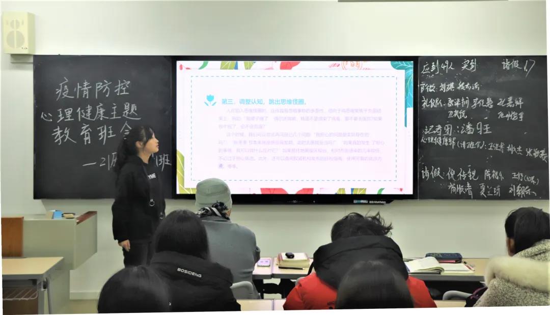 本次讲座各班主讲人向同学们阐述了疫情防控下的心理健康的重要性和必要性。各班以PPT的形式,结合相关事例,向同学讲解了心理调节的正确方法,并让同学们分享了自已关于疫情期间心理状态和变化,大家积极参与、踊跃发言、集思广益,为保持良好的心态提供了可行的建议。各班主持人呼吁同学们在疫情期间尽量不要外出,并强调了在疫情期间心理健康及疫情防控的主要措施,帮助同学们形成积极健康的心理状态。