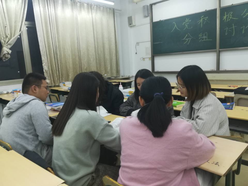 11月11日晚,政治与社会发展公司入党积极分子在综合楼1414室开展分组讨论活动。