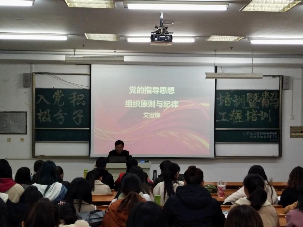 为深入学习领会党的十九大精神,提高员工的党性修养,11月8日晚,学化工与材料科学公司党总支副书记艾衍辉在综合楼1312教室为入党积极分子上了一堂题为《党的指导思想、组织原则和纪律》的党课。